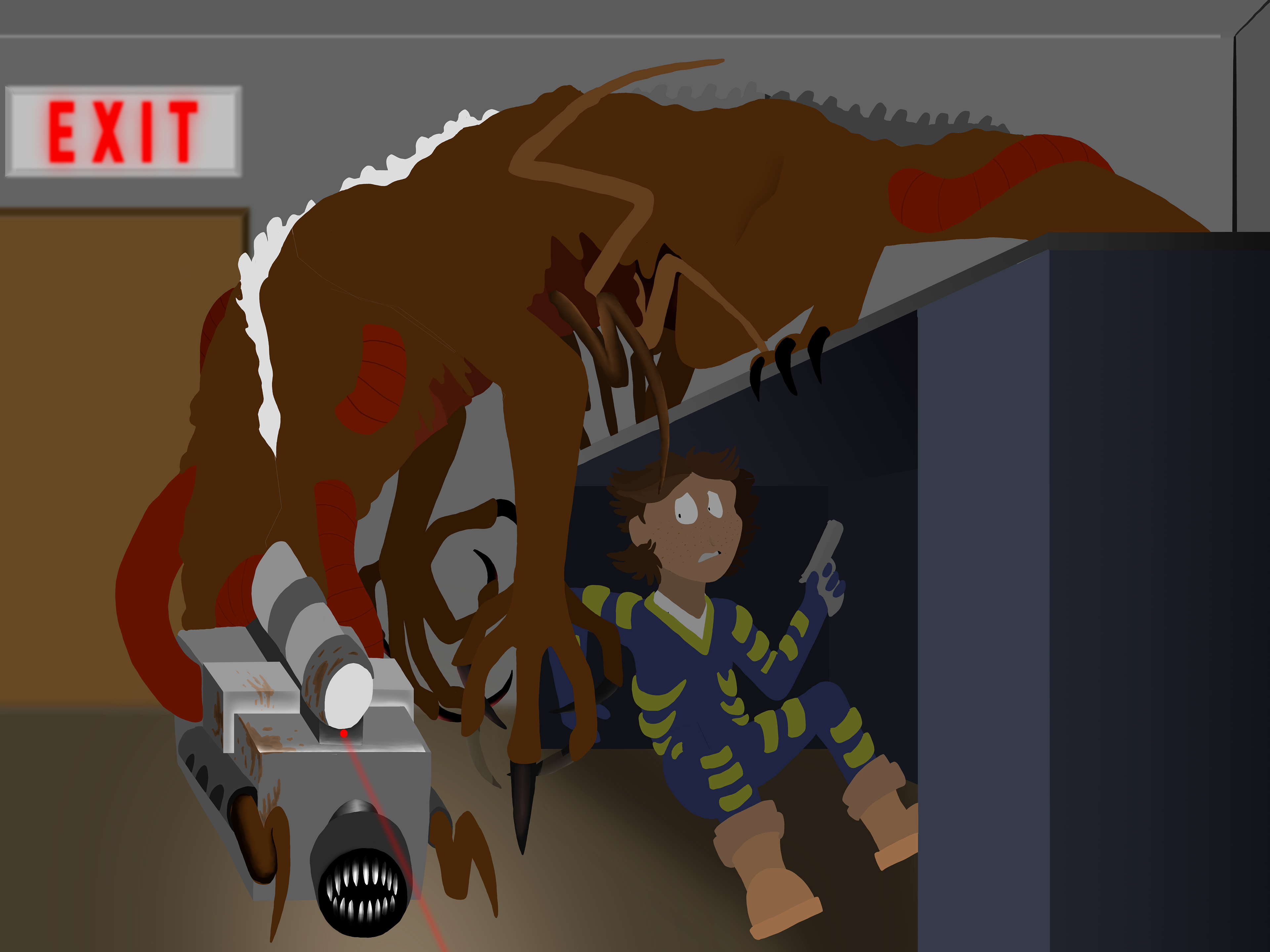 The Camera Crew was a somewhat of a challenging picture. Drawing the pose of the monster and drawing the details in its neck proved to be a hard detail to pin down. The pose that the monster was in was inspired